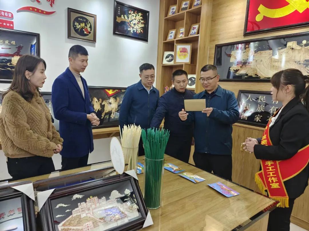 仪式结束后,何钢一行参观了工作室,工作室负责人详细介绍了工作室筹备过程、麦秆画制作灵感、手工工序及下一步创作创新想法。