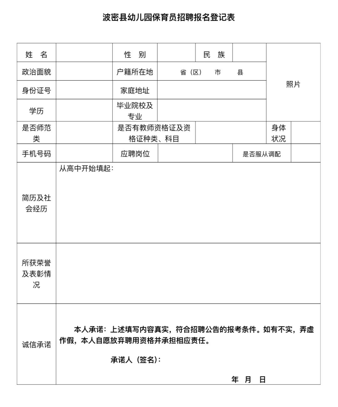 1.波密县幼儿园保育员招聘报名登记表