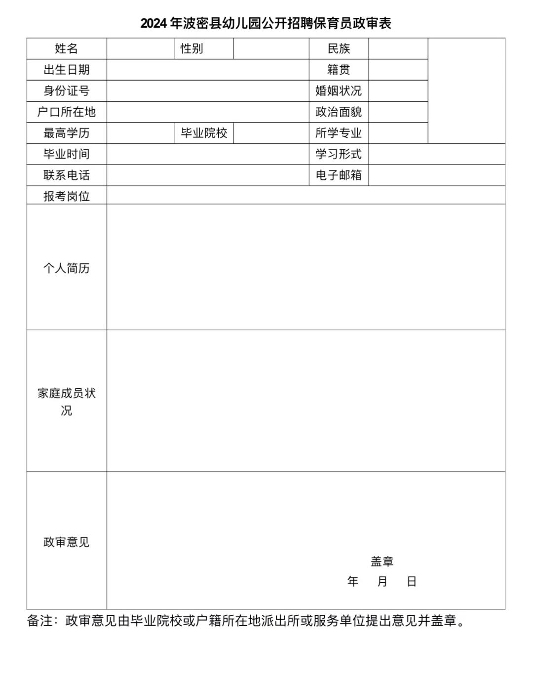 (4)2024年波密县幼儿园招聘保育员政审表;