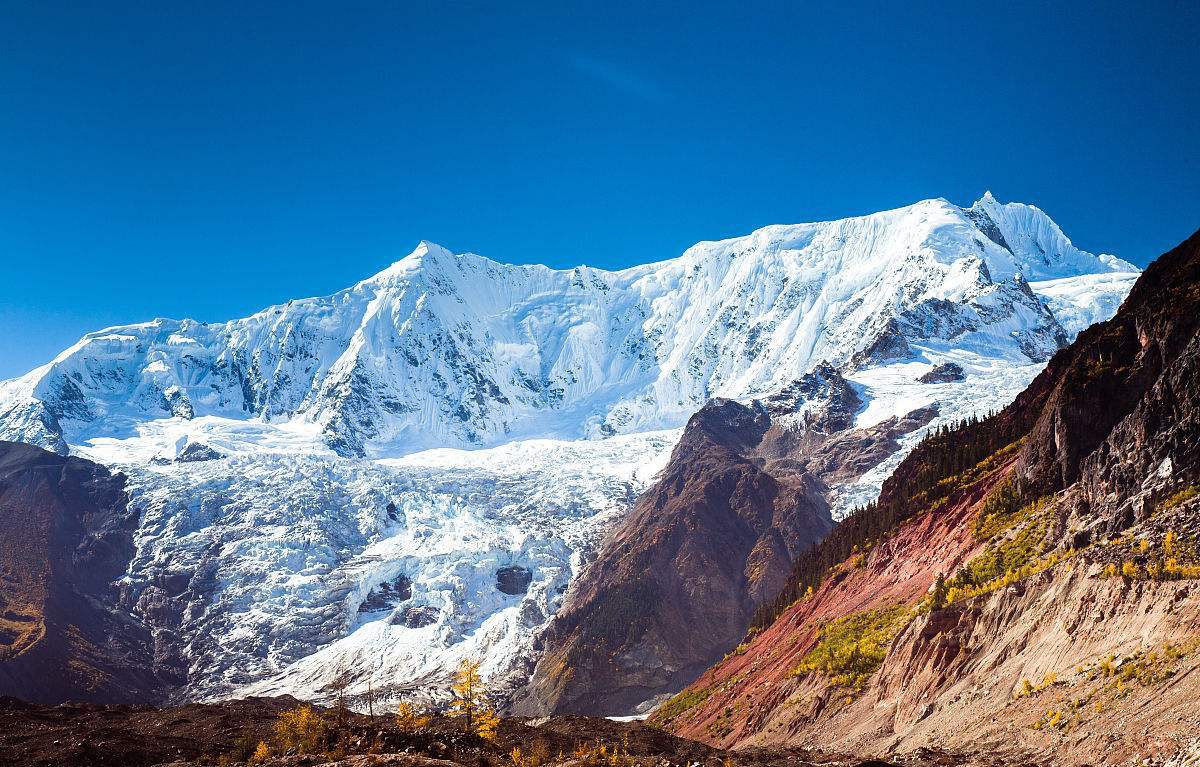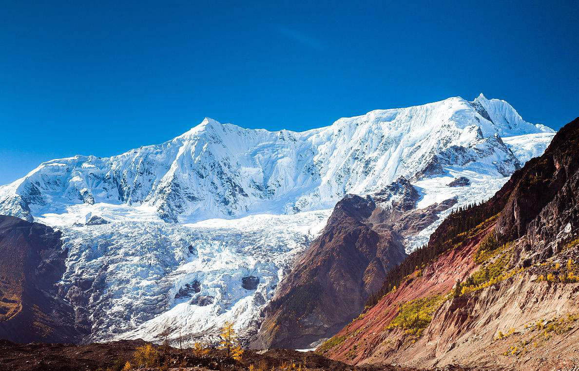 冰川周边,山花烂漫映雪山,林海葱茏舞银蛇,正是对“一山连四季,十里不同天”的完美诠释。