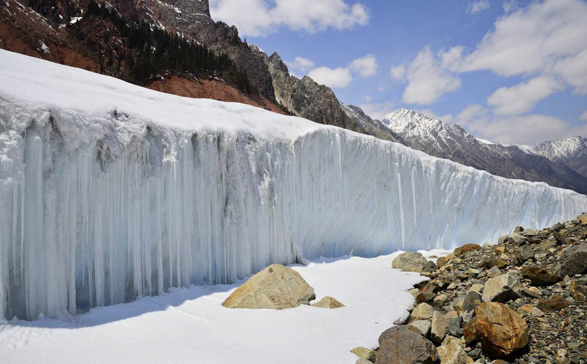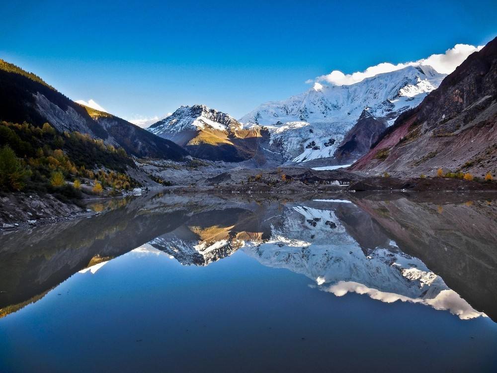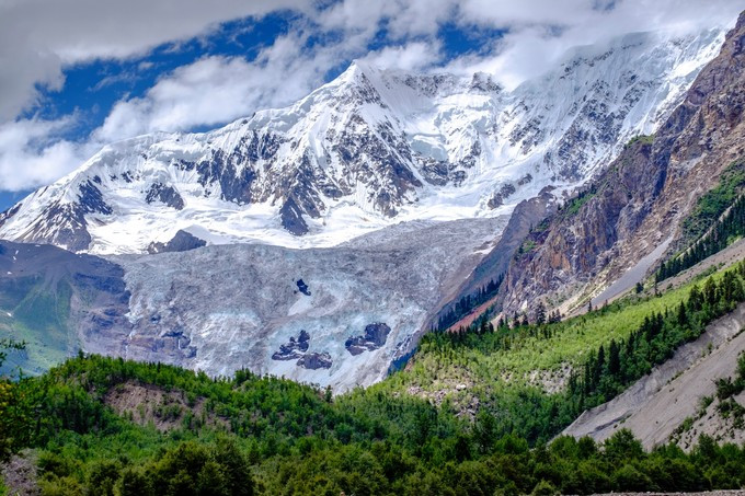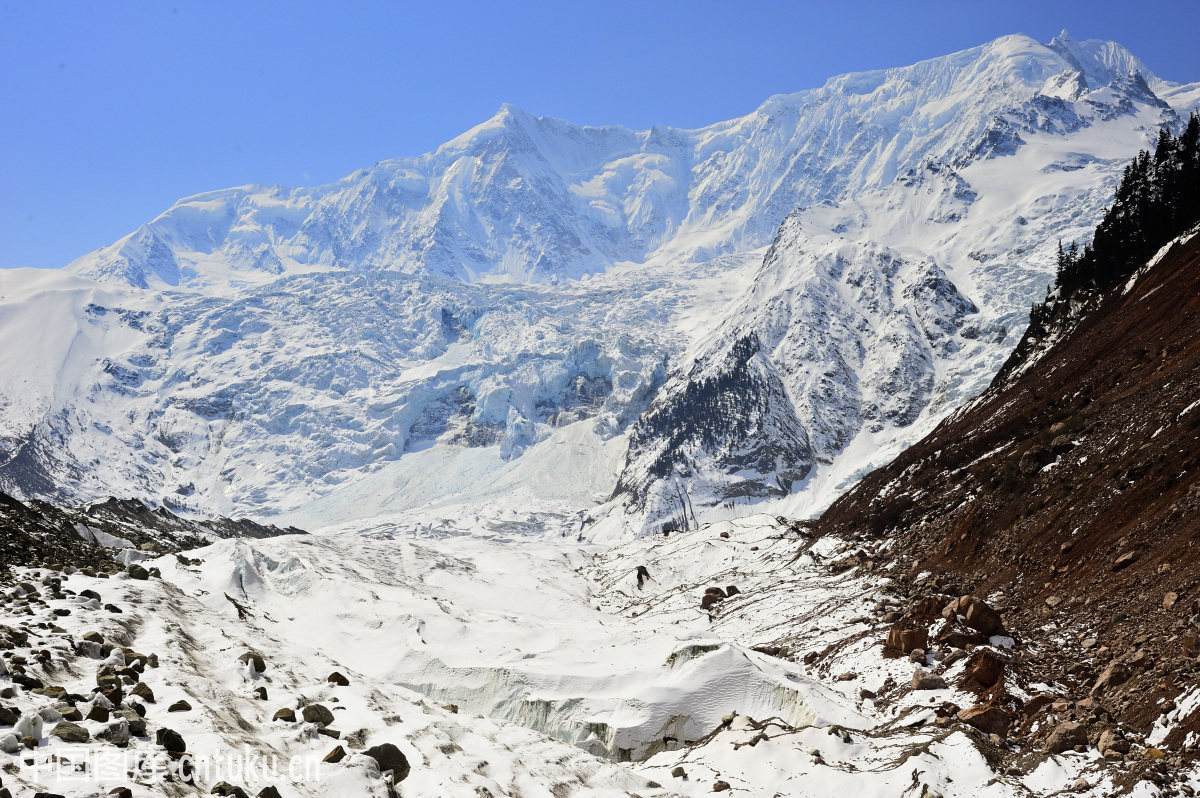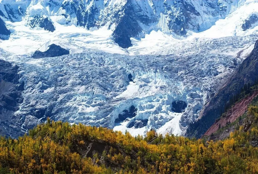米堆冰川由世界级的冰瀑布汇流而成,每条瀑布高800多米,宽1000多米,两条瀑布之间还分布着一片原始森林。